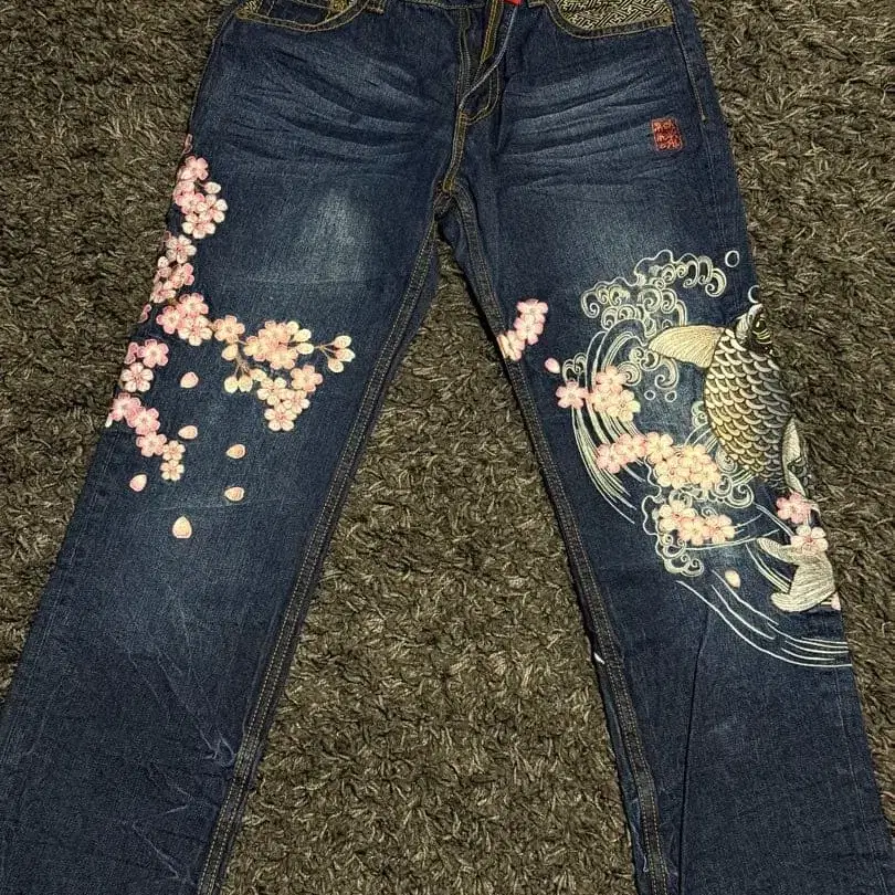 류기압삭 카라쿠리타마시 벚꽃 잉어 자수 데님 팬츠