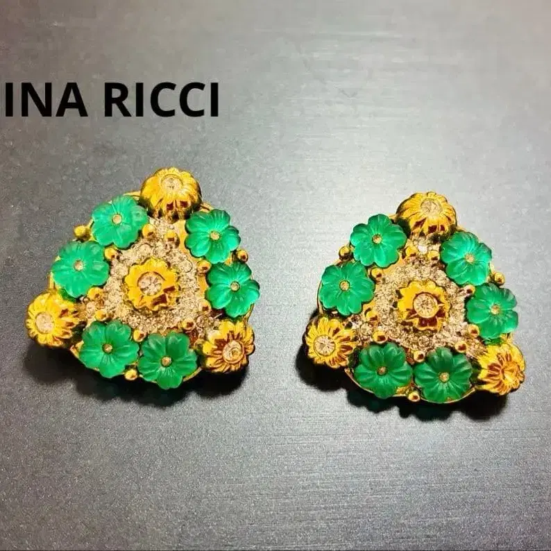 레어 니나리치 빈티지 플라워 모티브 귀찌 다이아 포함 그린 골드