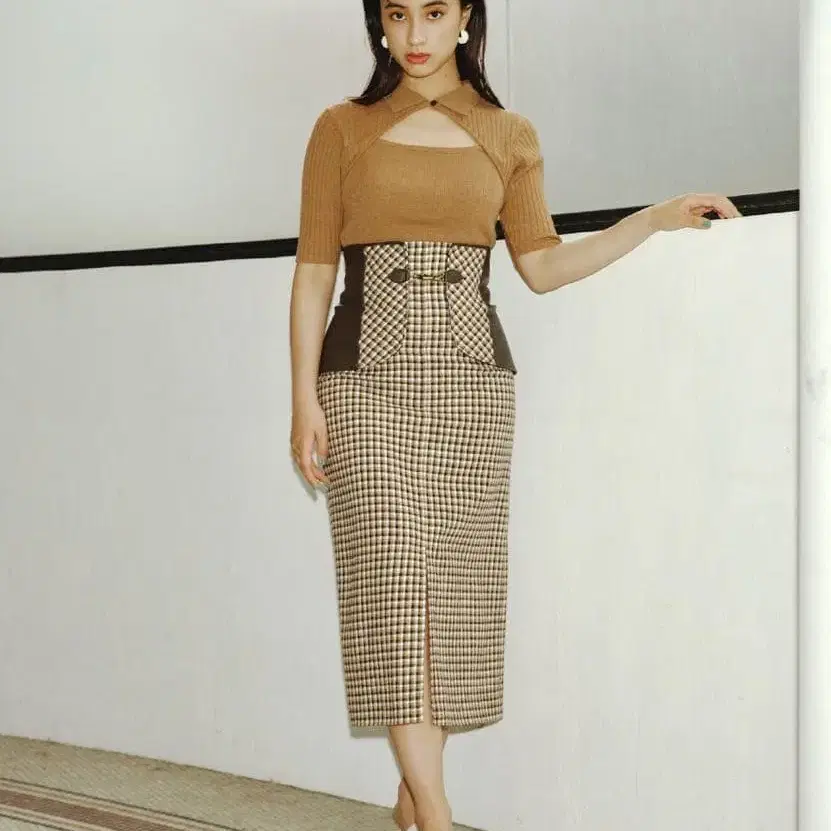 [ Design/Styling ] 도킹된 코르셋이 포인트인 타이트 스커트. 모티브에 비트 부품을 사용하여 고급스러운 인상은 남기면서, 체크의 바이어스 사용과 인조 가죽의 절개로 위트 있는 디자인으로 완성했습니다. 프론트 슬릿으로 발 움직임이 편하고, 내추럴한 느낌도 더했습니다. 미디 기장이라 키가 작은 분도 균형감 있게 착용 가능합니다. 하이웨스트 스커트를 살려, 상의는 얇은 소재의 니트나 블라우스를 IN한 스타일링을 추천합니다. [ Fabric ] 스커트 본체는 울 혼방의 따뜻한 원단으로 마무리했으며, 코르셋 절개에는 인조 가죽을 사용했습니다. 허리는 밴딩 사양으로 스트레스 프리한 착용감입니다.