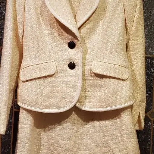 아이보리 트위드풍 자켓과 원피스 세트입니다. 라메사가 섞여 있어 반짝이는 고급스러운 럭셔리 수트입니다. 원피스는 반팔입니다. 페인트 플레이 디자인이라 세부까지 신경 쓴 디자인입니다 ♡ 사진 9, 10번째에 올풀림을 라이트를 비춰 촬영했습니다. 사이즈는 M, 클리닝 완료 - 색상: 아이보리 - 스타일: 자켓과 원피스 세트 - 디자인: 버튼 부착, 포켓 부착, 카라 부착 - 소재: 트위드풍 원단, 라메사 축하 행사, 입학식, 발표회 등에 꼭 활용해 보세요 (*^^*) 잘못 구매했기 때문에 취소 및 반품은 정중히 사양하오니 이미지를 잘 보시고, 질문이 있으시면 언제든지 문의해 주세요 (*^^*) 깨끗한 상태이지만 새 상품은 아니므로 신경 쓰이시는 분은 삼가해 주세요. 방문해 주셔서 감사합니다. 색상 - 아이보리 얼룩, 찢김, 냄새 등 - 없음 색상 - 화이트 계열