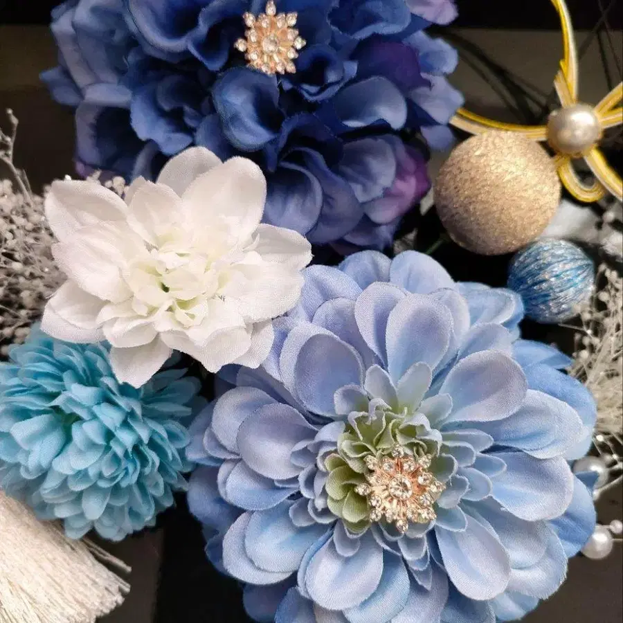 기모노 종류 - 후리소데 일본 정통의상 소품 - 머리 장식 헤어콤 색상 - 블루 색상 - 화이트 ♥ 꽃 중심의 비쥬가 불필요하신 분은 말씀해 주세요. 2번째 사진입니다. ※ 달리아 약 10cm ※ 백일홍 약 10cm ※ 국화 약 5cm ※ 미니 달리아 약 5cm ※ 매화 매듭 태슬 ※ 나비 미즈히키 장식 ※ 펄 가랜드 ※ 공 장식 피크 ☓ 2 ※ 안개꽃 모두 U핀으로 제작되었습니다. ※ 태슬이나 꽃 색상 변경 등이 가능합니다. ~~~~~~~~~~~~~~~~~~~~~~ ※ 사용된 꽃은 도쿄당 MAGIQ, 아스카(ASCA), YDM 등 일본을 대표하는 브랜드의 아티피셜 플라워입니다. (생화를 닮게 만든 조화입니다.) 하나하나 정성껏 만들고 있습니다. 여러분들의 좋은 날에 꽃을 더할 수 있기를 바랍니다. 기모노 종류 - 후리소데 파랑과 하양의 조화와 태슬이 어우러진 화려한 세트. - 색상: 파랑, 화이트, 보라색 - 소재: 합성섬유, 장식용 비즈 - 디자인: 태슬과 꼬임 끈 장식 - 색감: 다색 ( 빨간색, 파랑, 핑크, 옐로우 컬러 등 ) - 꽃 종류: 조화 ( 달리아, 국화 등 ) 방문해 주셔서 감사합니다.