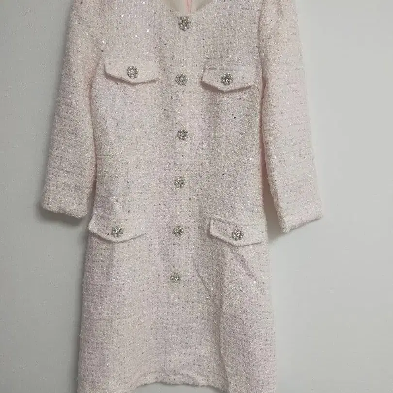고급 핑크 트위드 원피스 펄 버튼 M 사이즈 세레모니/경사