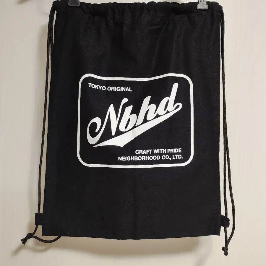 자동 번역되었어요. 원문보기TOKYO ORIGINAL 블랙 드로우 스트링 백, NbhD 로고 포함.