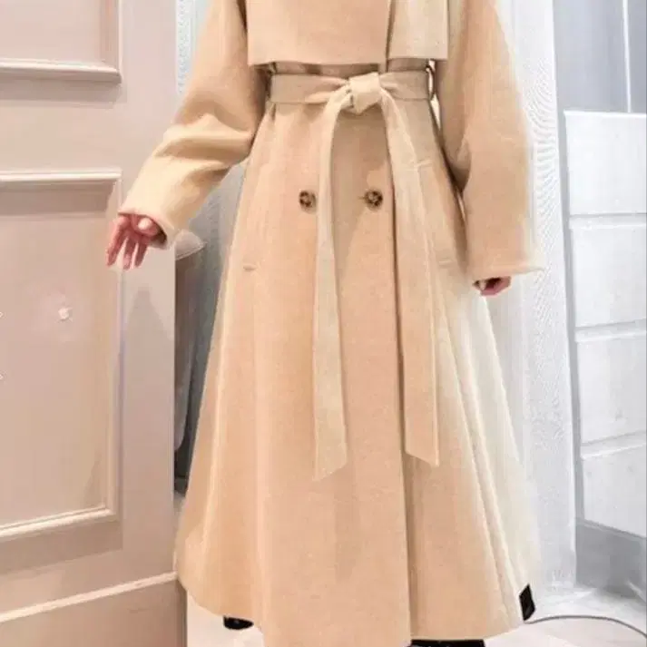 자동 번역되었어요. 원문보기더블 브레스트 디자인의 베이지 롱 코트,