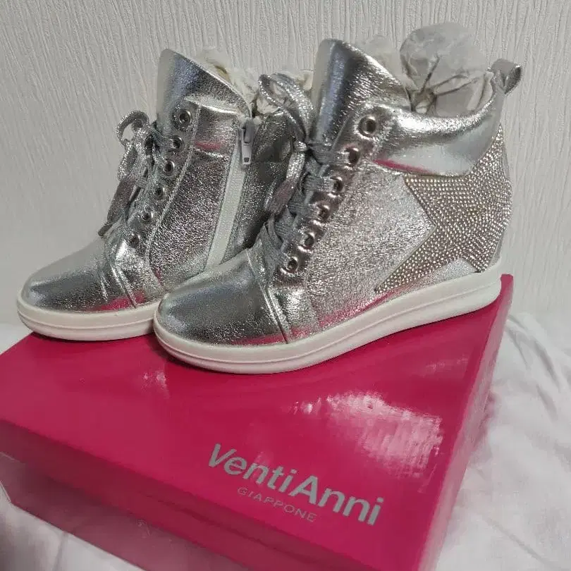 실버 PU 소재로 스타일리시한 디자인의 스니커즈.