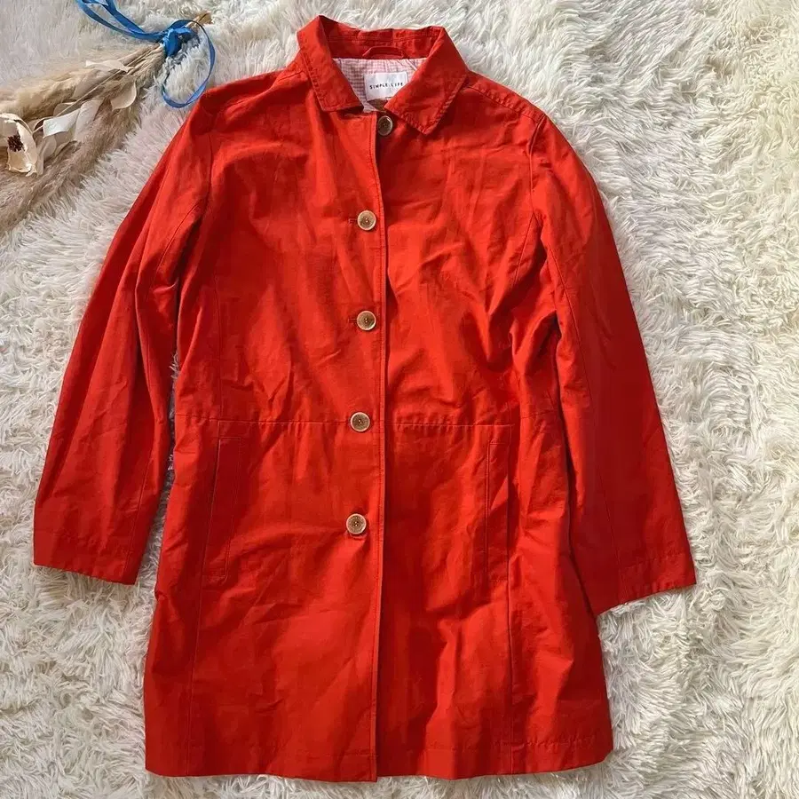 ◯ 특징: 오렌지색 코튼 소재 롱 코트, 버튼이 있고 체크 무늬 안감.