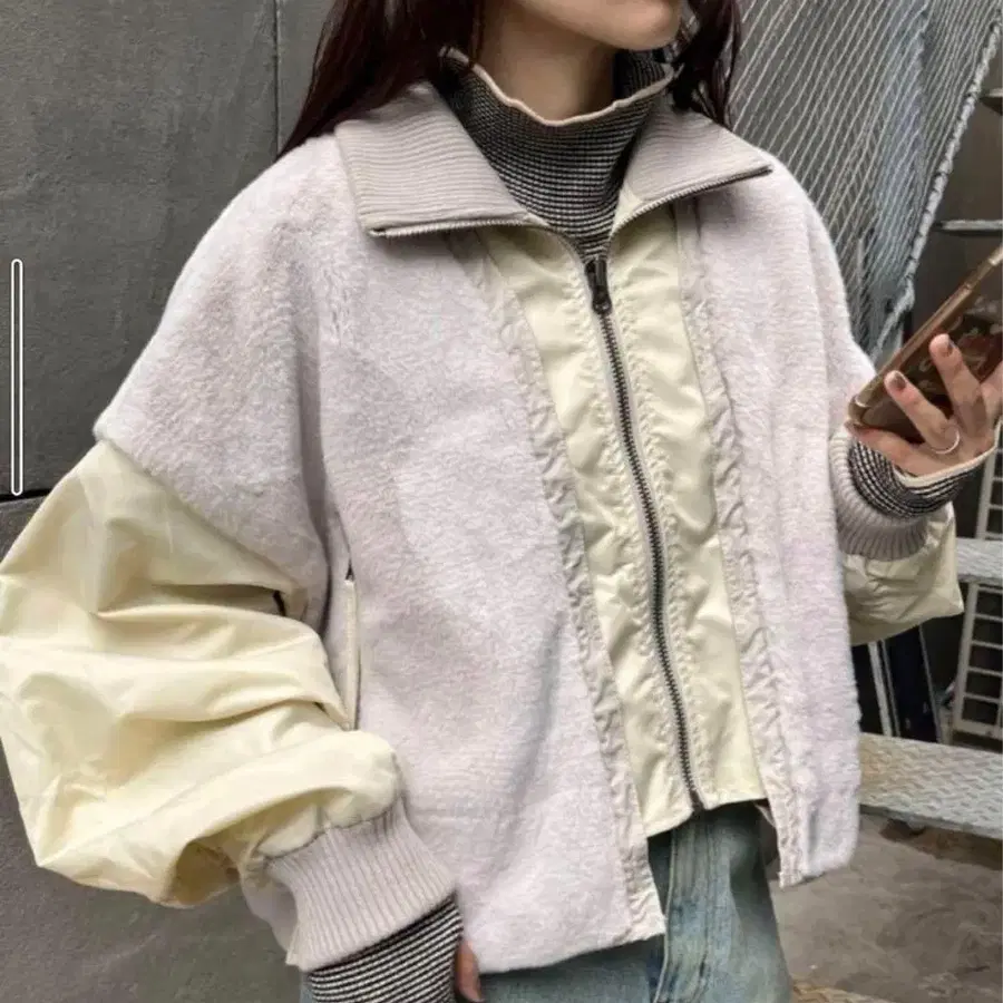 [ etsinta/에신타 ] 퍼 절개 숏 스탠드 자켓 아이보리