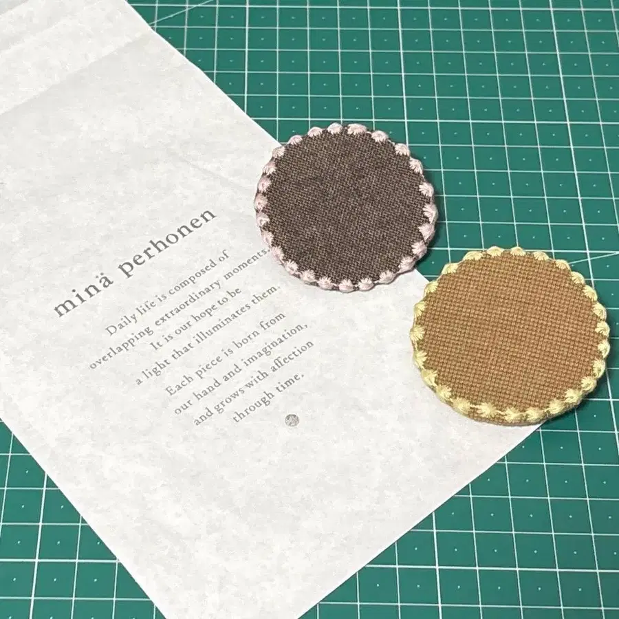 미나 페르호넨의 의류를 만들 때 나오는 오리지널 텍스타일의 작은 자투리 천을 사용하여 만든 배지입니다.