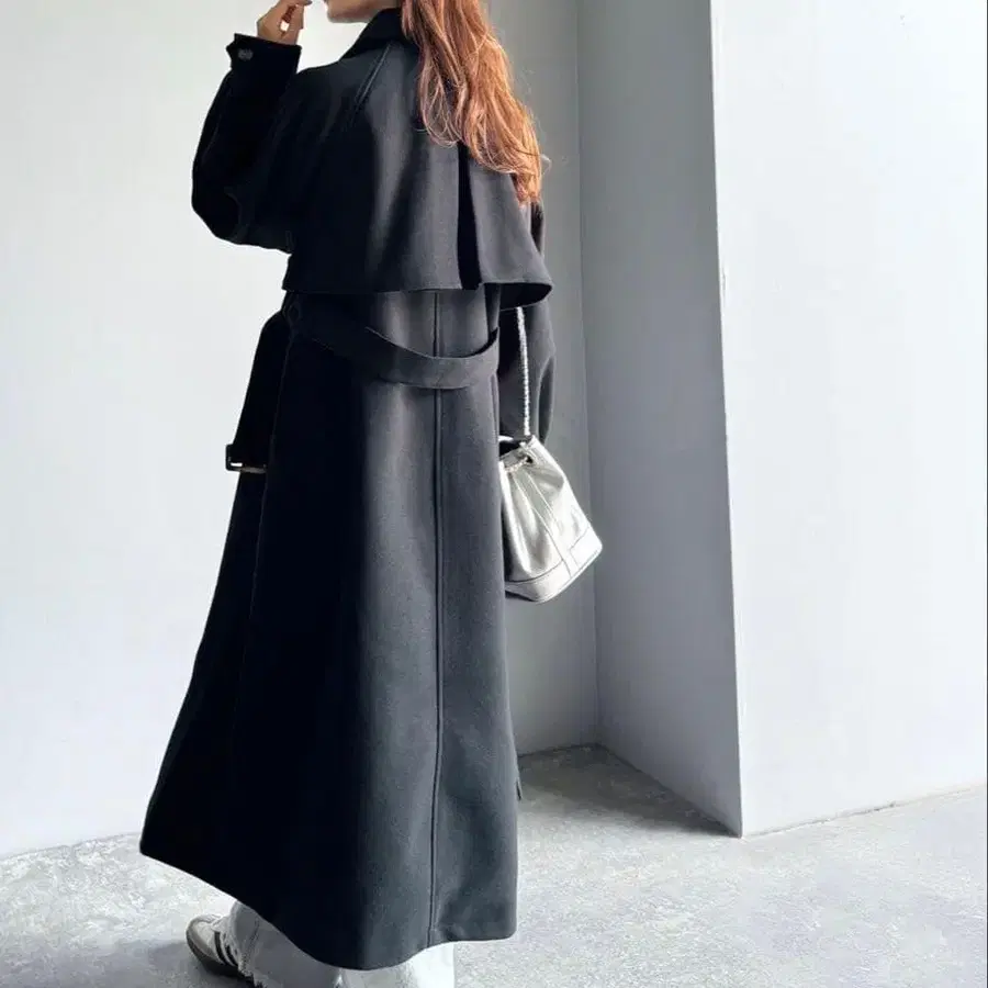 블랙 롱 코트 프론트 버튼 벨트 포함