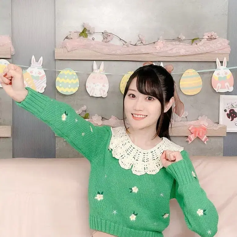 오구라 유이 착용 레이스 옷깃 꽃무늬 자수 니트 그린
