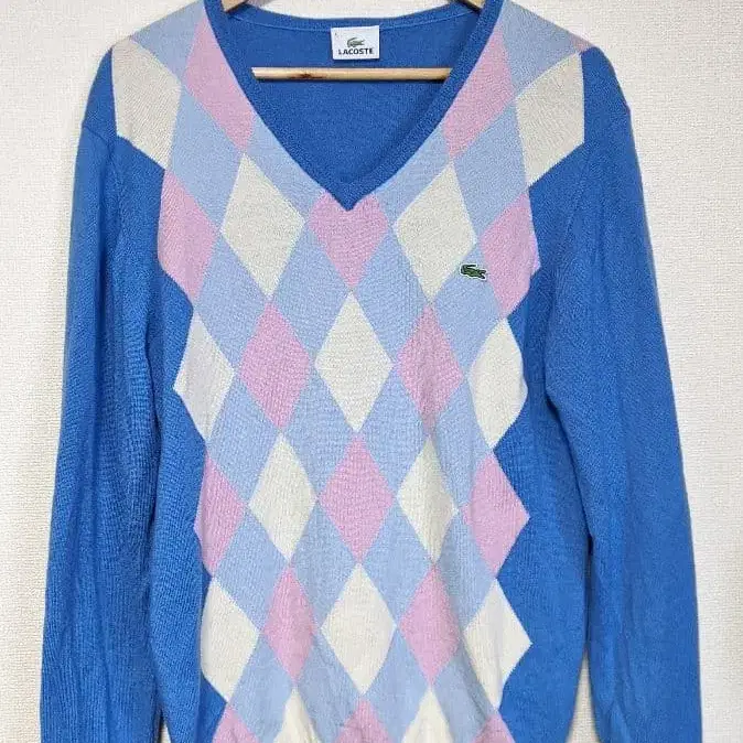 자동 번역되었어요. 원문보기다이아몬드 패턴의 V넥 스웨터, LACOSTE 악어 로고 포함.