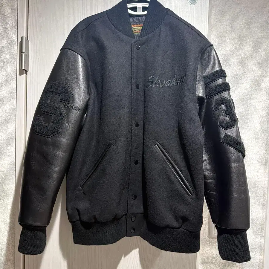 콜라보 SKOOKUM 블랙 가죽 바시티 자켓