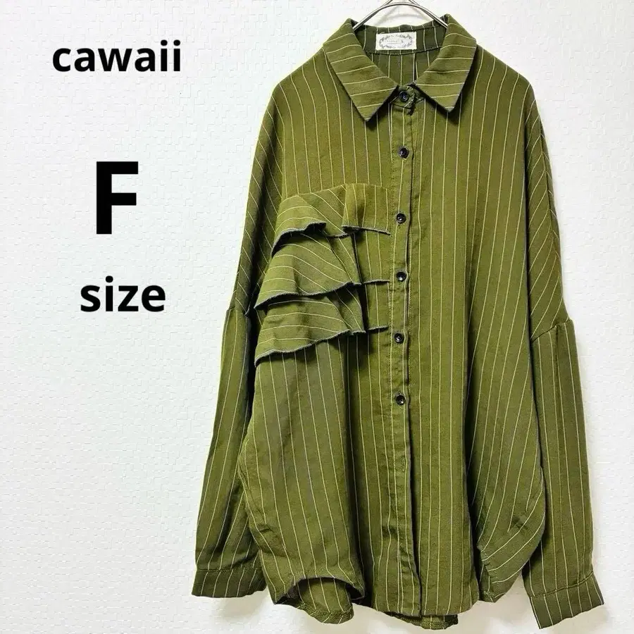 ♥ 올리브 그린 스트라이프 패턴 셔츠, 프릴 디자인이 특징입니다.