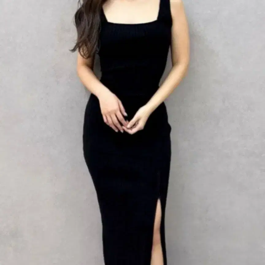 GYDA 블랙 리브 니트 롱 원피스 백 오픈 지퍼 슬릿