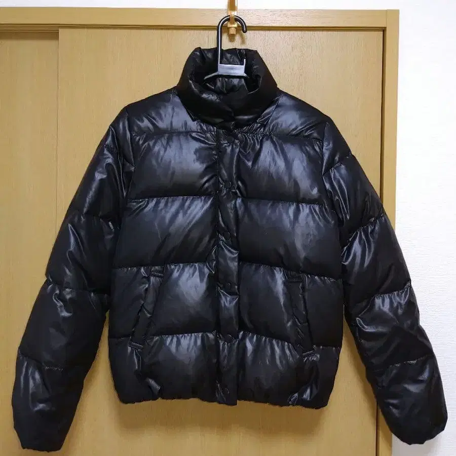 광택이 있는 블랙 다운 자켓으로, 지퍼와 단추식 디자인이며 가벼우면서도 보온성과 스타일을 모두 갖췄습니다.