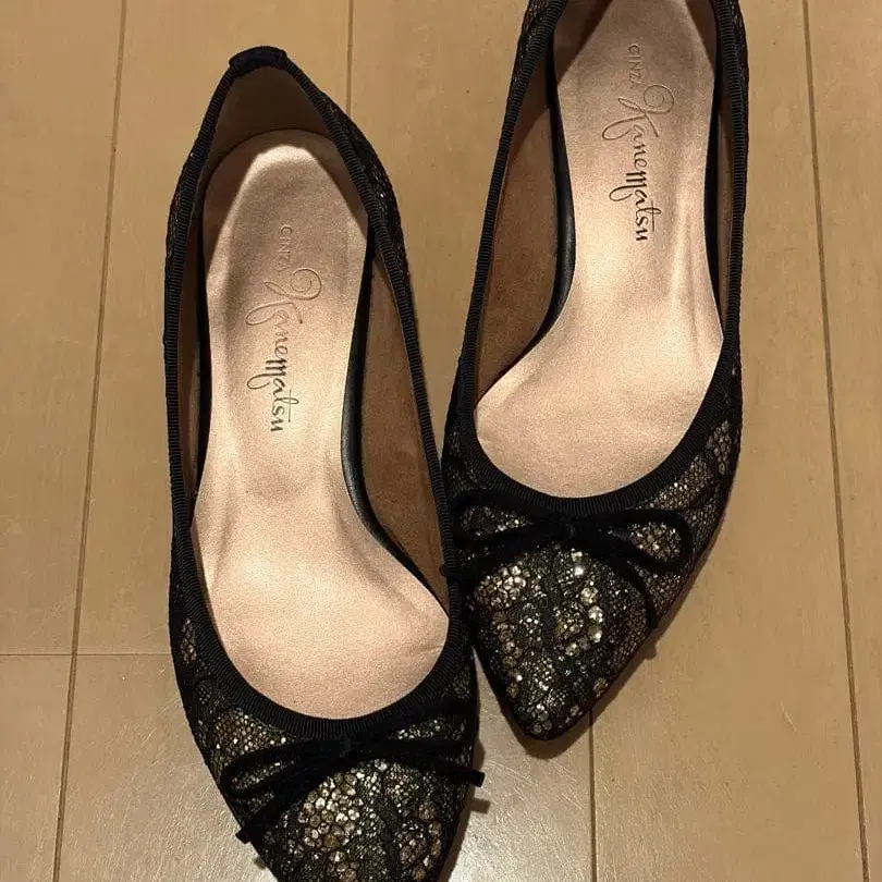 [ 익명 배송 ] 긴자 카네마츠 반짝이는 레이스 소재 블랙 골드 플랫슈즈
