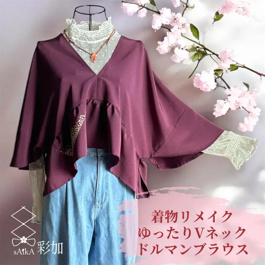 #기모노 리메이크 #호몬기 #상의 #V넥 #공동 팔괘 #돌먼 #넉넉한 블라우스 #레이어드 차분한 보라색에 전통 기법인 금박이 살짝 더해진 공동 팔괘 원단을 레이어드 코디에 활용하기 좋은 돌먼 블라우스로 만들었습니다. 비침이 거의 없어 자유로운 코디로 캐주얼하게 즐길 수 있는 심플하고 넉넉한 풀오버 블라우스로 완성했습니다. 어깨의 자연스러운 드롭감도 고급스럽습니다. 일본풍 색감의 보라색과 고급 실크 원단을 일상에서 즐겨보세요. 소재: 순수 실크 상의 기장 41-49 가슴 너비 64 화장 64 카라 윗부분 너비 21 앞 아래 18 / 뒤 11 리사이클 기모노를 사용한 리메이크 의류입니다. 기모노를 최소한으로 해체하고 재단한 것을 다시 짓고, 가능한 한 원래의 일본식 바느질이 적용된 손바느질 부분을 그대로 살렸기 때문에 얼룩, 변색, 올풀림, 바늘 구멍, 냄새 등이 있을 수 있습니다. 기모노로서의 역사를 느껴주시면 기쁘겠습니다. 가정에서 세탁하실 수 있도록, 재단 전에 세탁하여 미리 수축시킨 후 제작했습니다. 실크 전용 중성세제 등을 준비해주세요. ☆ 세탁 포인트 ☆ 원단을 문지르지 말고 부드럽게 눌러 빨아주세요. 세탁부터 헹굼까지는 손으로 하고, 탈수는 망에 넣어 세탁기에서 30초~1분 정도 짧게 해주세요. 원단을 잘 펴서 그늘에 말려주세요. 물이 떨어지지 않을 정도의 수분 무게로 주름이 펴지고 원단이 부드럽게 완성됩니다. ★ 주의 사항 ★ 실크는 마찰에 약하므로 비벼 빠는 것은 절대 금합니다. 담가 두거나 강하게 탈수하지 말고 직사광선을 피해 그늘에 말려주세요. ※ 다른 사이트에도 게재되어 있습니다. 모든 사이트 중 선착순 주문을 우선으로 하므로 품절 시에는 양해 부탁드립니다. sAikA의 기모노 리메이크 최근, 장인의 손으로 정성껏 만들어진 역사적인 기모노들이 리사이클되어도 입을 기회를 잃고 잠들어 있는 상태입니다. 대대로 이어져 온 소재에 담긴 마음을 윤리적으로 현대 생활에 맞게 업사이클링하여, 일본과 서양의 융합과 발전을 목표로 한 [화혼양재]의 정신으로, 지금 시대에 어울리는 일본식 의류를 전달합니다.