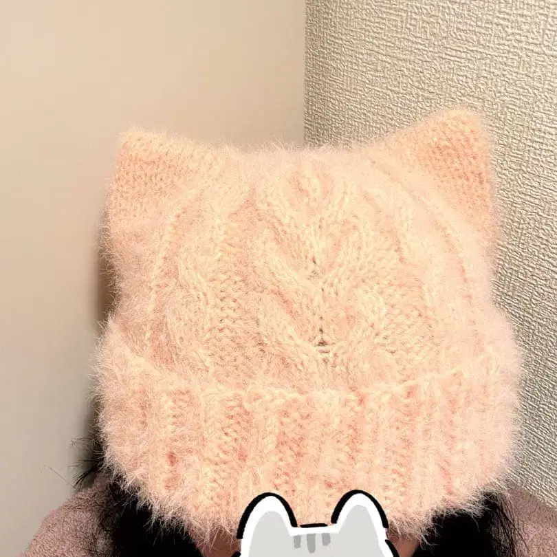 고양이 귀 달린 복슬복슬 니트 모자 핸드메이드 핑크