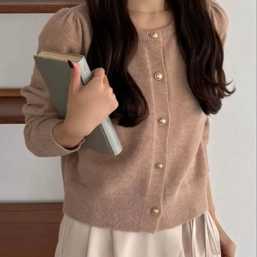 카라우티아 골드 버튼 퍼프 슬리브 숏 니트 가디건