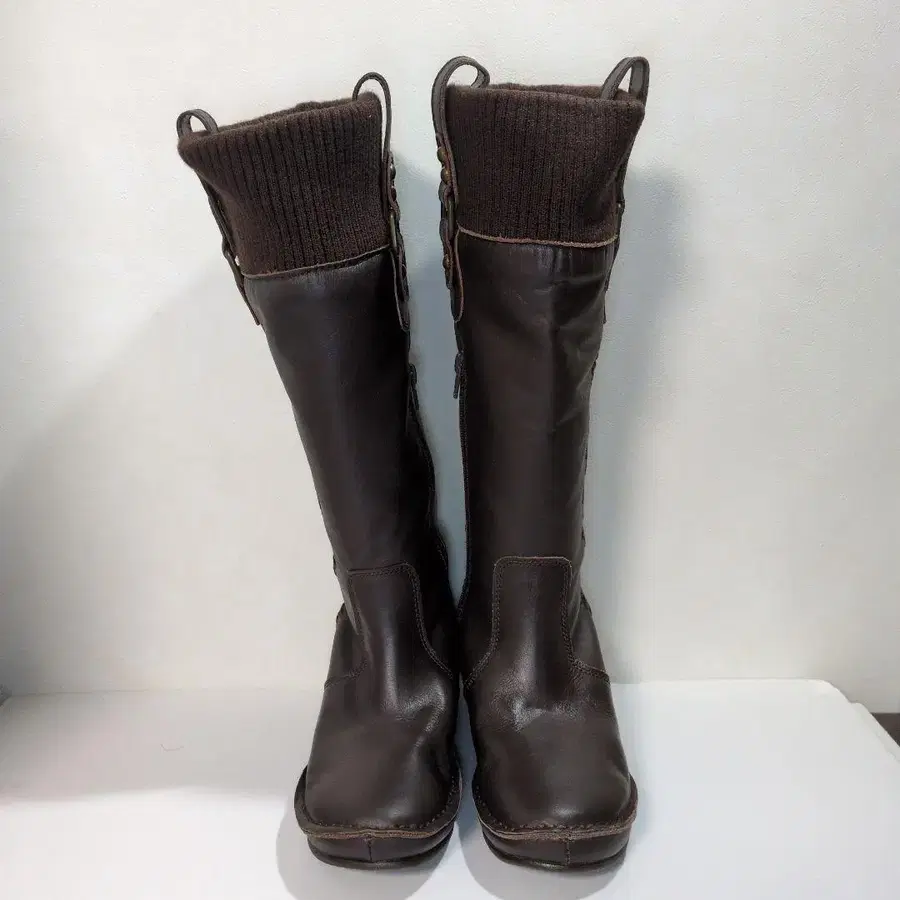 자동 번역되었어요. 원문보기다크 브라운 색상의 가죽과 니트 소재 롱 부츠, 백 지퍼와 버튼이 달린 스트랩으로 스타일리시합니다.