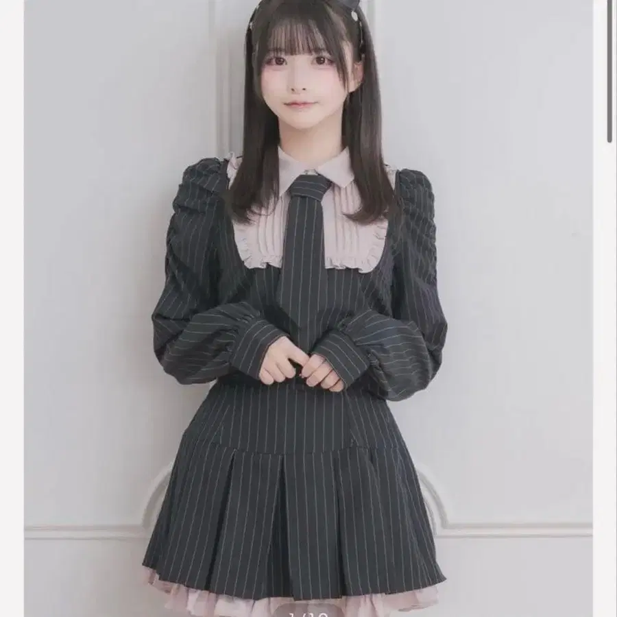 pium 넥타이 포함 스퀘어 프릴 긴팔 상의 & 스커트 블랙 스트라이프
