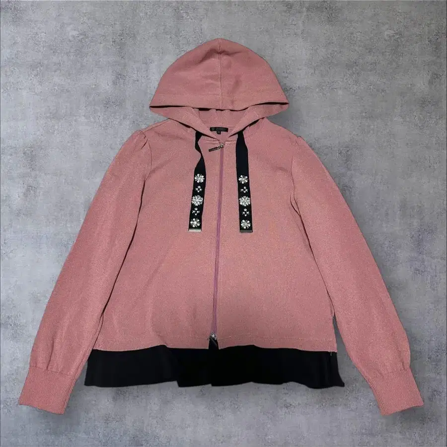 차분한 핑크 컬러에 밑단의 블랙 프릴이 악센트가 된 고급스러운 디자인입니다. 후드 리본 부분에는 비쥬 장식이 되어 있어 캐주얼하지 않고 성숙/러블리하게 입으실 수 있습니다.