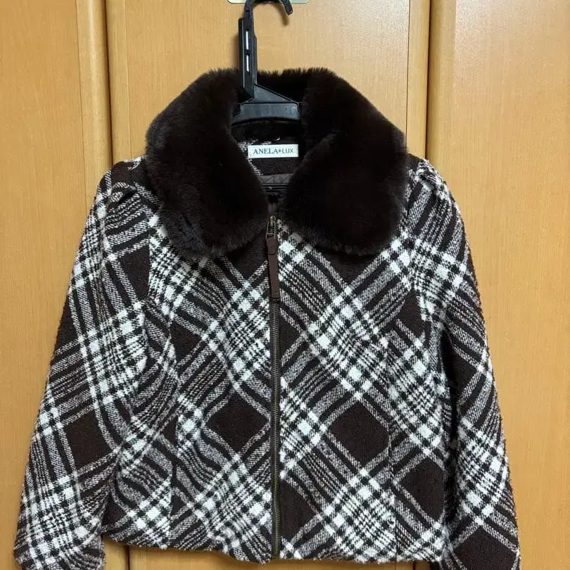브라운 계열 체크 탈부착 가능한 퍼 카라 부착 자켓