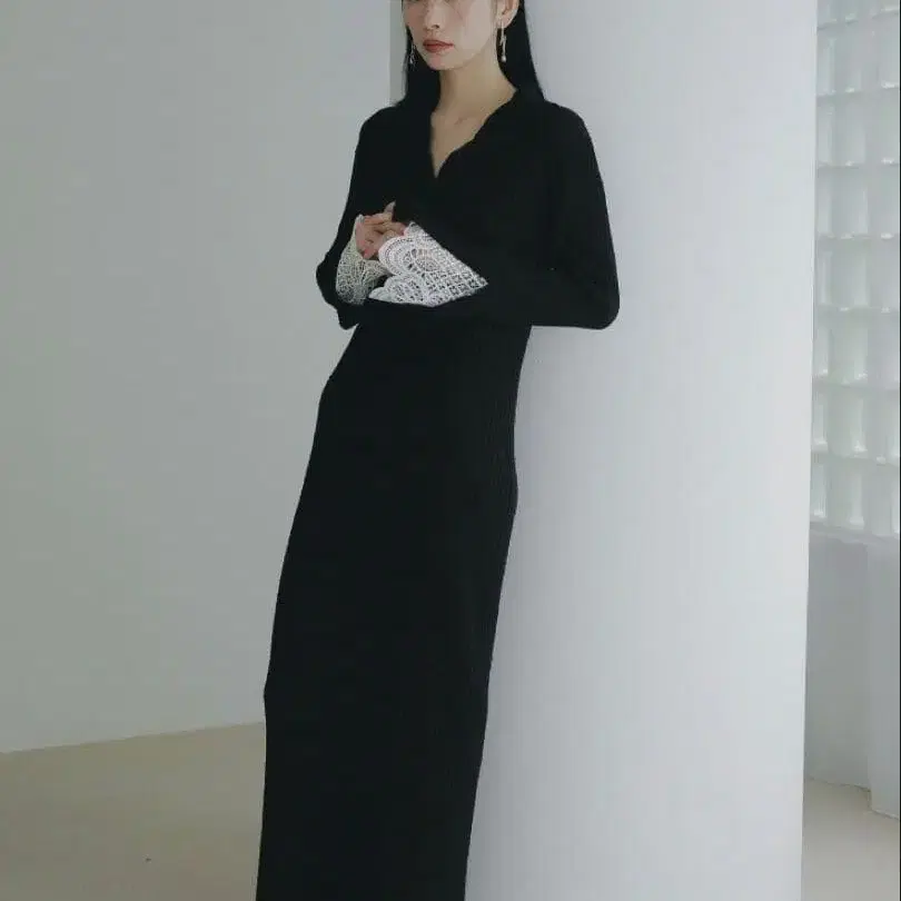 라그나문 레이스 슬리브 네프 리브 니트 원피스 블랙 M