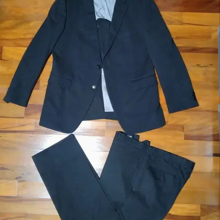 자동 번역되었어요. 원문보기다크 그레이 스트라이프 패턴의 2버튼 비즈니스 정장.