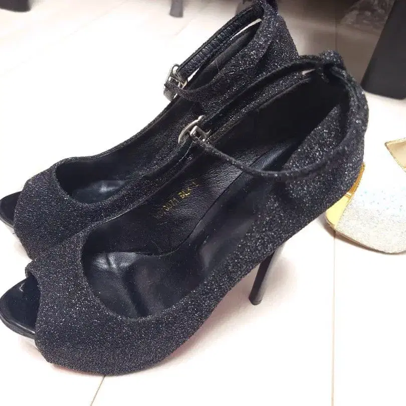 블랙 글리터 오픈토 하이힐 사이즈 37