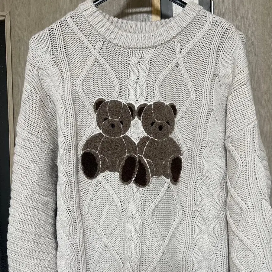 곰 자수 화이트 케이블 니트 긴팔 스웨터