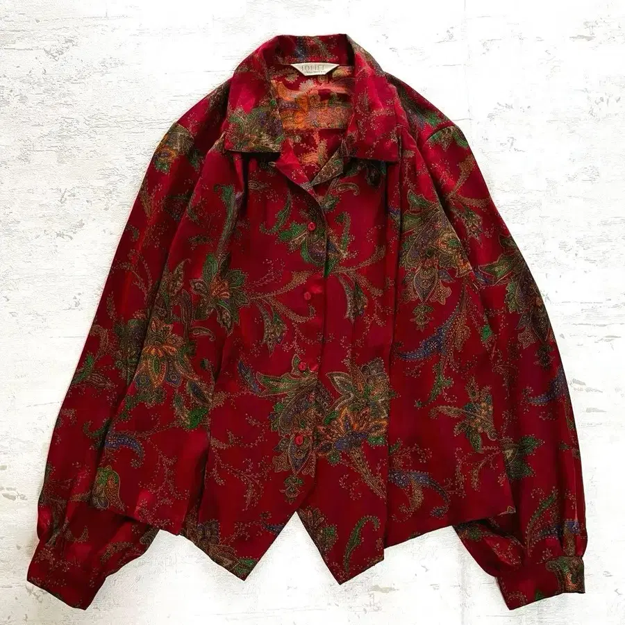 차분한 빨간색을 베이스로, 섬세한 페이즐리 무늬가 전체적으로 들어간 긴팔 블라우스입니다.