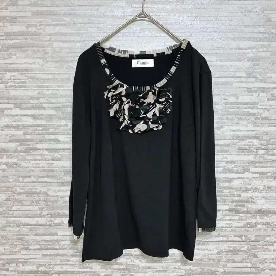 S'ninon selected의 목 부분에 입체적인 플라워 모티브가 장식된 디자인이 특징인 긴팔 상의.