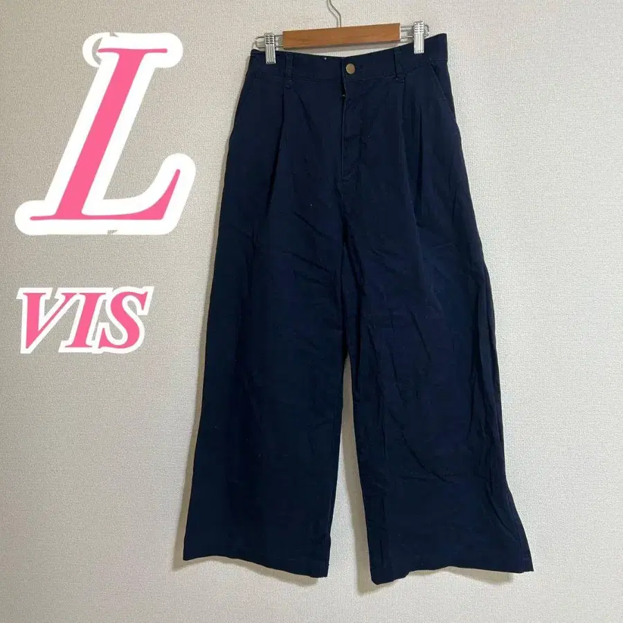 자동 번역되었어요. 원문보기네이비 색상의 면 100% 소재로, 쾌적한 착용감의 L 사이즈 와이드 팬츠.