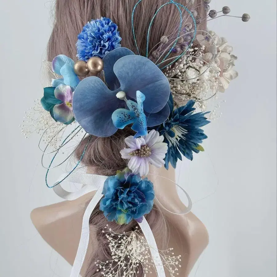 머리 장식 성인식 졸업식 결혼식 파랑 화이트 핑크 미즈히키 안개꽃 난