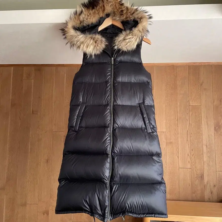 띠어리 후드 부착 롱 다운 베스트 블랙 베스트
