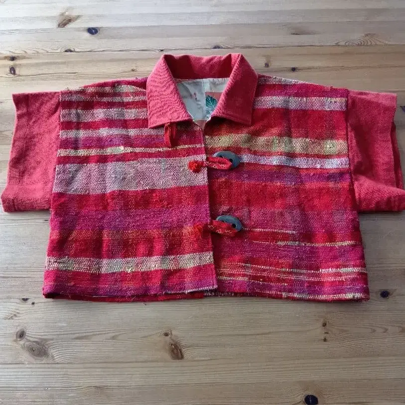 빈티지 원단으로 만든 찢어 엮은 재킷과 베스트입니다.