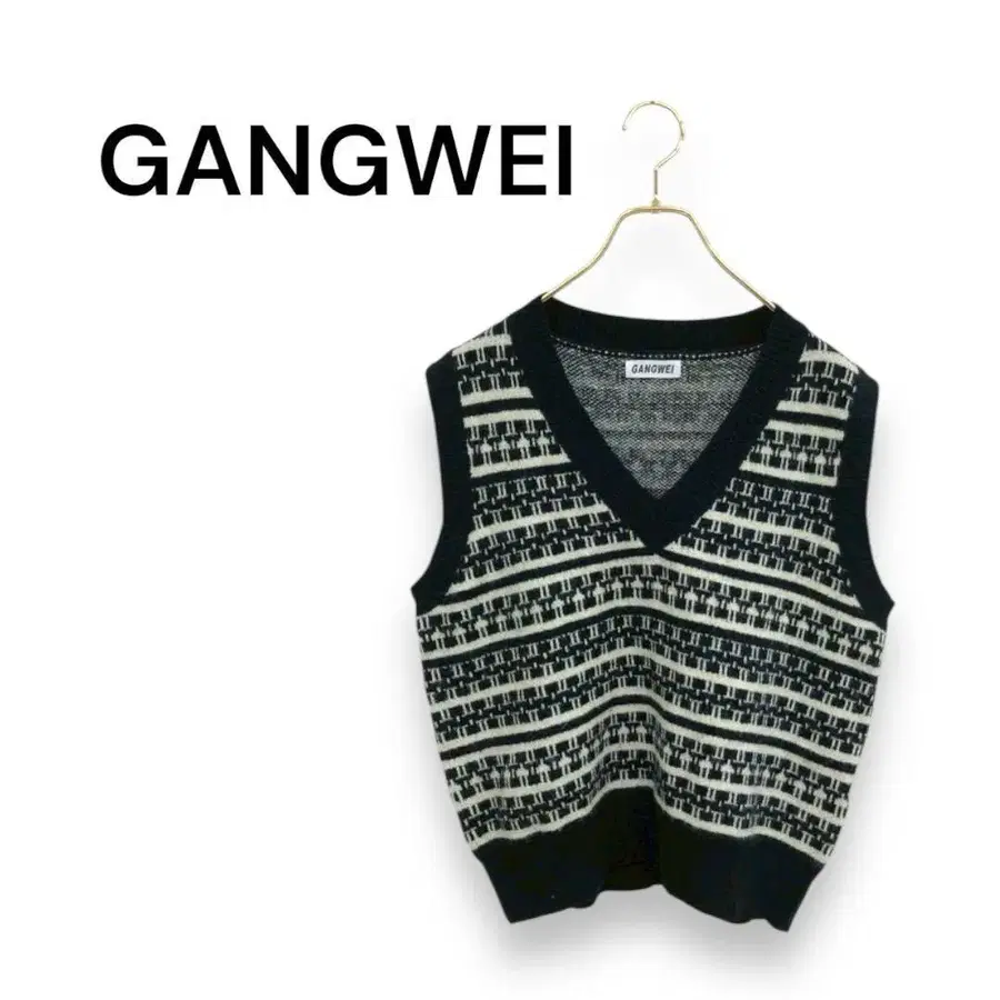 [ GANGWEI ] 니트 베스트 V넥 보더 레이어드 귀여운 블랙