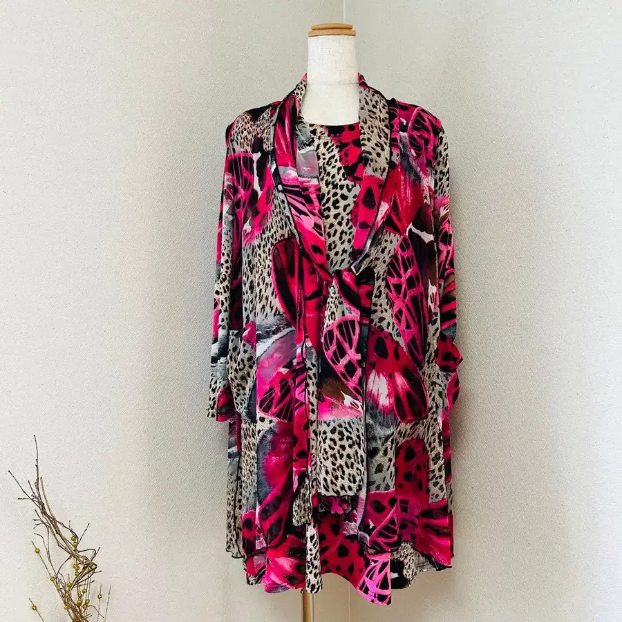 컨디션 최상 앙상블 튜닉 가디건 표범 무늬 나비 핑크 2점 [ L ]