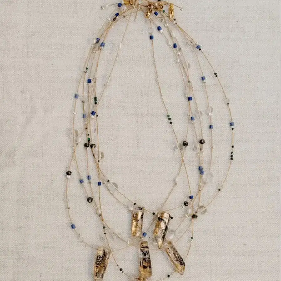 섬세한 골드 와이어에 색과 모양이 다양한 비즈가 랜덤으로 흩뿌려져 있습니다.