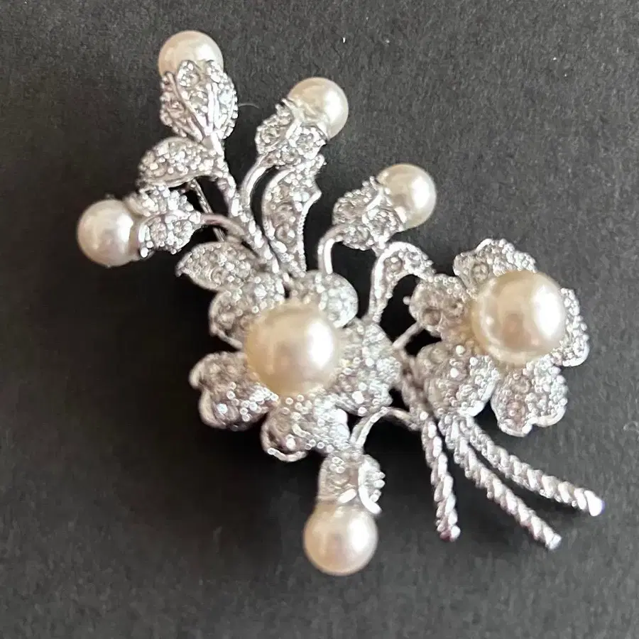 꽃과 모조 진주의 실버색 브로치