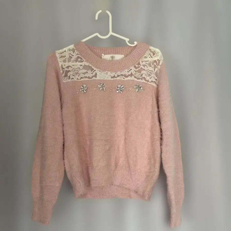 핑크 긴팔 니트 스웨터 레이스 비쥬