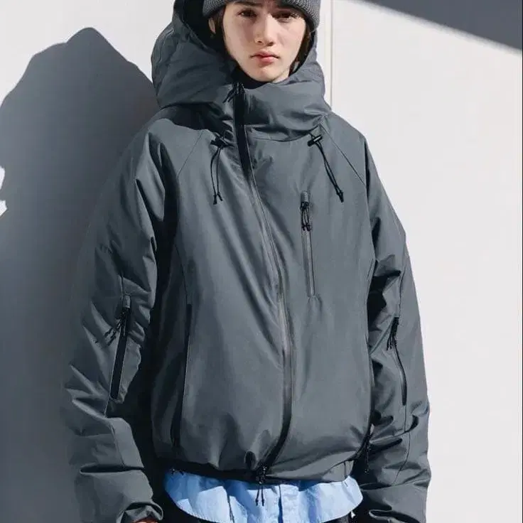프론트에는 사선으로 들어간 지퍼 디자인을 채용하여 턱 아래 간섭을 방지하면서 쾌적한 착용감을 실현했습니다. 또한, 양팔과 프론트에는 총 5개의 방수 지퍼 포켓을 배치하여 디자인성과 기능성을 겸비했습니다. 짧은 기장이 이번 시즌 트렌디하고 도시적인 실루엣을 연출합니다.
