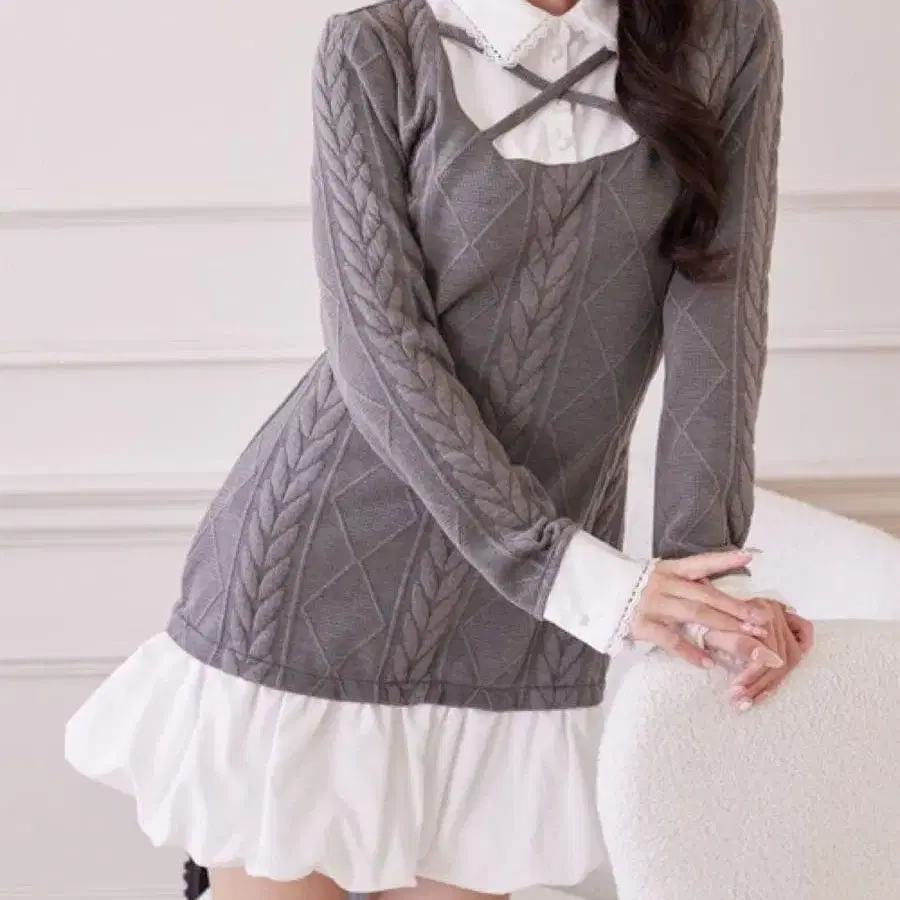 수윤 레이스 장식 셔츠 도킹 벌룬 원피스