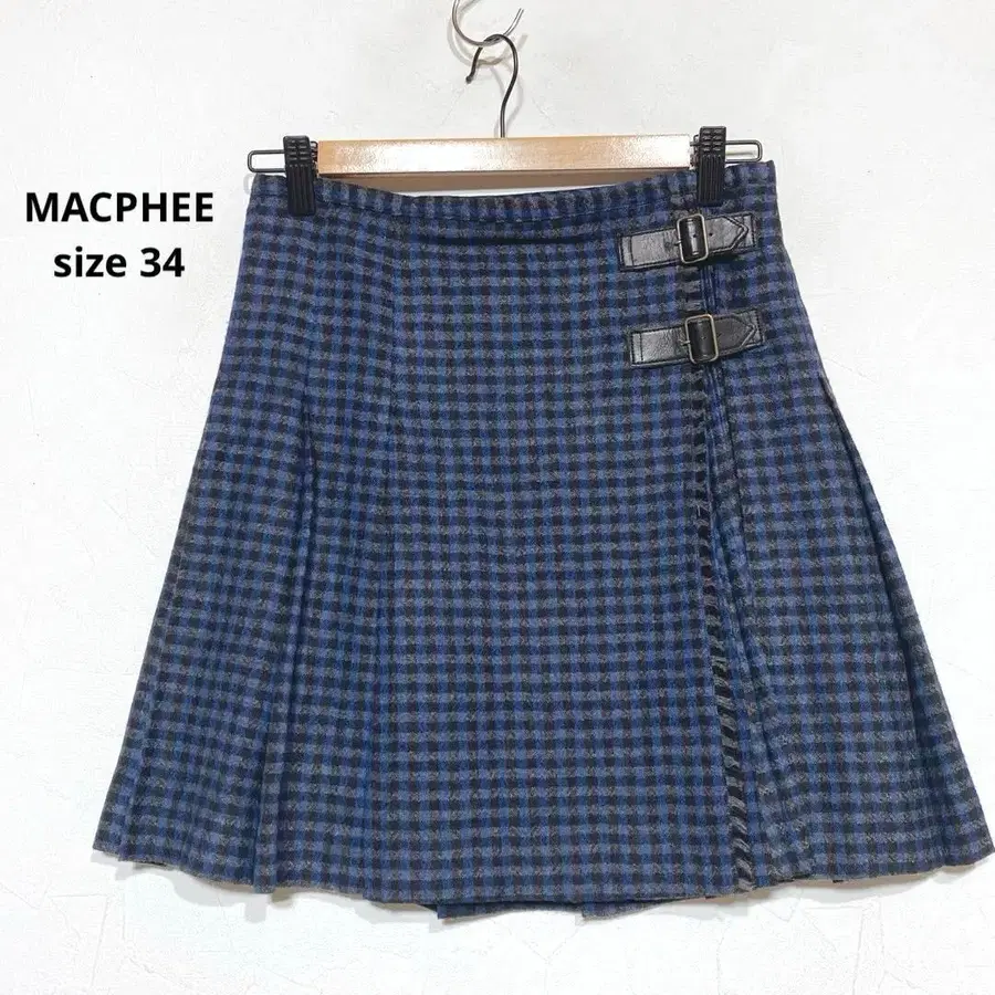 파랑과 블랙 체크 무늬의 플레어 스커트, 사이드 버클 포함.