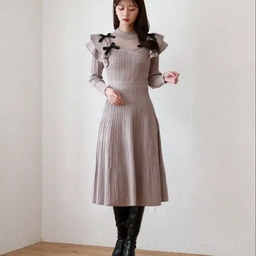 cheek 티크 데콜테 시어 프릴 리본 원피스