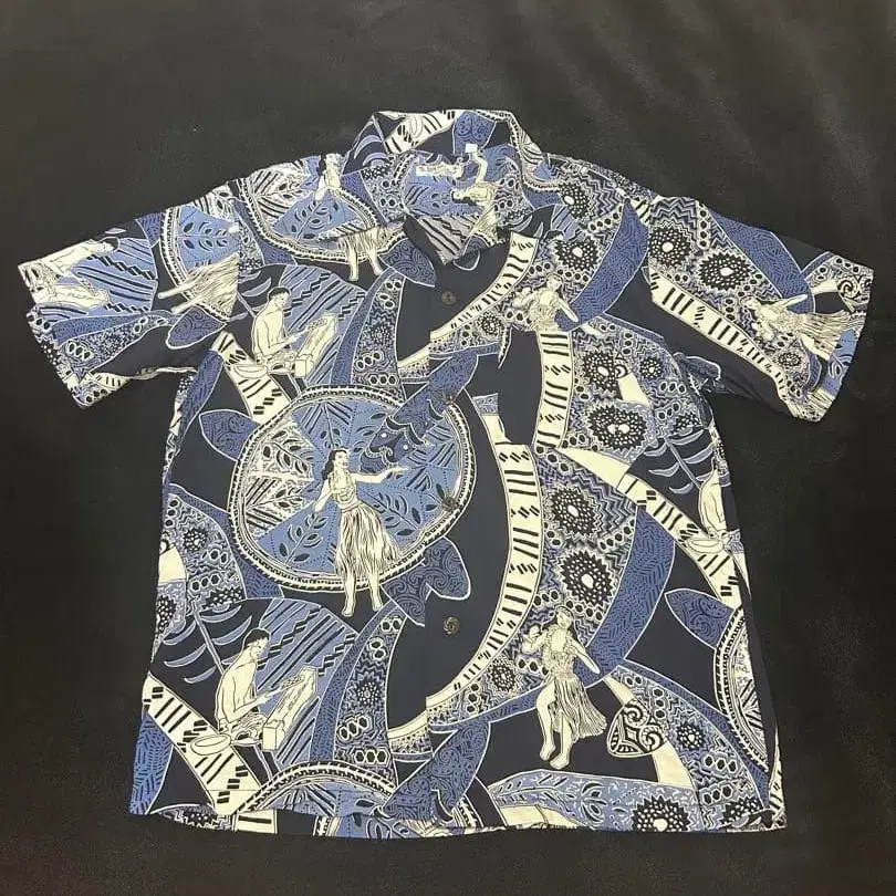 자동 번역되었어요. 원문보기하와이안 프린트의 파랑과 화이트 반팔 셔츠, 레이온 소재로 쾌적한 착용감.