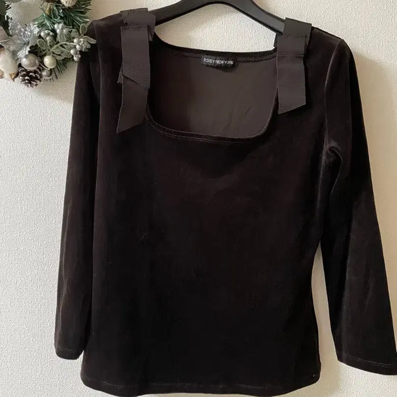 FOXEY 블랙 벨로아 소재 리본 포함 긴팔 상의