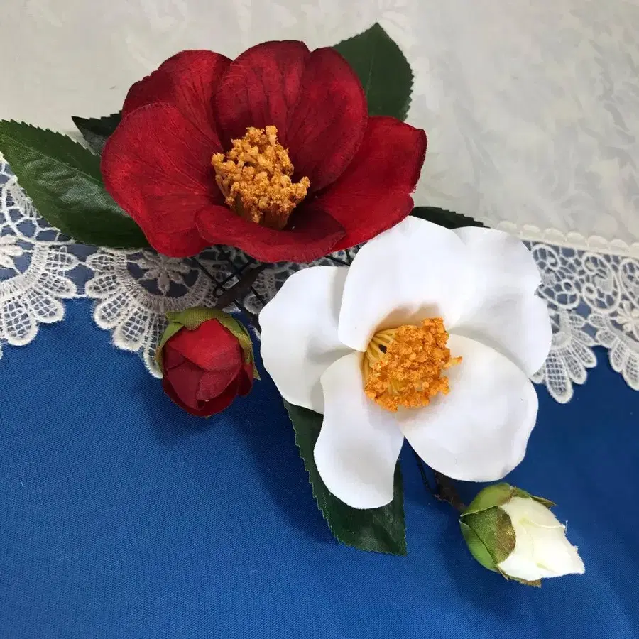머리 장식 빨흰 동백꽃 1세트 결혼식 성인식 졸업식
