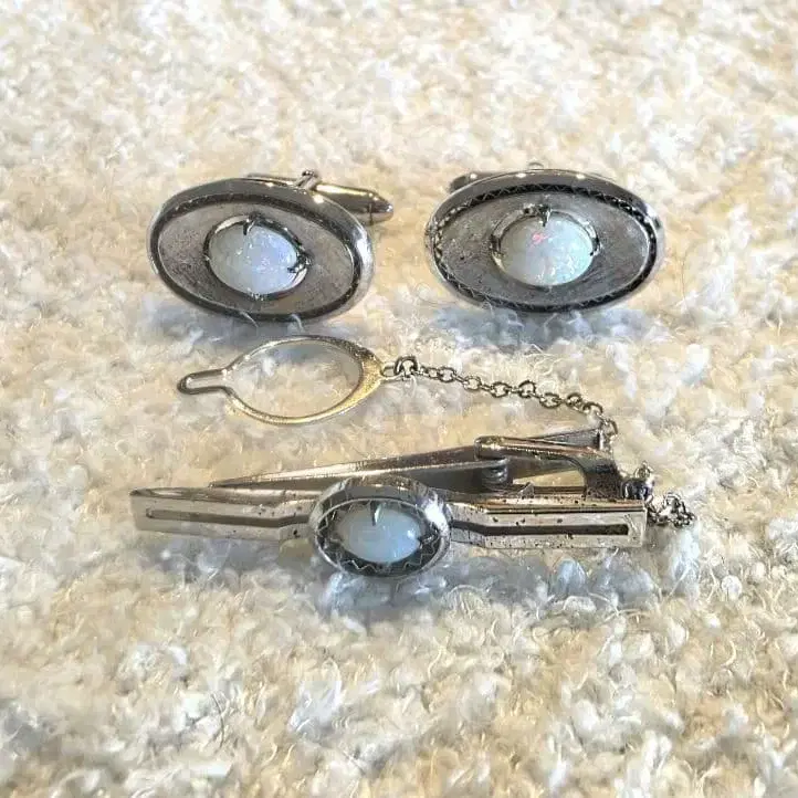 [ SUN EAGLE PAT.A ] 각인이 새겨진 넥타이핀과 커프스 세트입니다. 빈티지 제품입니다. 실버 소재이며, 오팔 계열의 보석이 박혀 있습니다. 넥타이핀 길이는 약 4cm 정도입니다. 이미지에서 볼 수 있듯이, 넥타이에 고정하기 위한 체인과 클로징이 부착되어 있습니다. 커프스 단추는 일반적으로 보급된 스위블식 (클로징이 회전하는 타입)입니다. 중앙의 오팔은 빛의 각도에 따라 무지개색 빛 (유색 효과)을 보여주며 개성을 연출합니다. SUN EAGLE 주식회사는 주로 전국 백화점을 대상으로 유명 브랜드의 타이바 (넥타이핀), 커프 링크스 (커프스 단추) 등을 전개하는 일본의 장신구 회사입니다. 제품: 다양한 소재와 디자인의 커프스 단추를 제조 판매하고 있으며, SV925 (스털링 실버) 및 양은 (저먼 실버 등의 합금)을 사용한 제품, 펄 및 기타 보석을 장식한 제품 등이 있습니다. 특징: 폭넓은 디자인 전개와 우수한 품질이 특징이며, 많은 제품이 시장에 유통되고 있습니다.